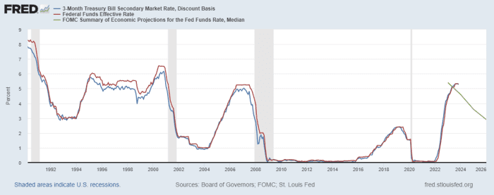 Six months later, the Fed, in its final meeting of the year, opted to keep its policy rate unchanged at 5.25% to 5.5%, a 22-year high, but Powell also finally signaled that enough was likely enough, and that a policy pivot to interest rate cuts was likely next year.